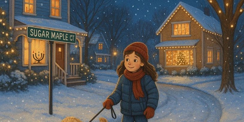 Aliza’s street is the brightest in town, because everyone puts up holiday lights in December, except for one neighbor who lives alone. One night, Aliza sees that there is a candle burning in this man’s house. She thinks that he has finally gotten into the holiday spirit, but it turns out that the light is coming from a yahrzeit memorial candle. Aliza gathers her friends to learn more about the candle and the man. In the end, with that candle burning, and everyone else’s holiday lights, Aliza’s street indeed becomes the brightest street in town. The intentionally subtle backdrop for this story is Aliza’s intermarried family.